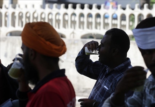 5月27日,在印度北部旁遮普邦阿姆利則地區(qū),人們?cè)谘谉岬奈绾蠛嚷愤吺圪u(mài)的甘蔗汁來(lái)消暑。新華社發(fā)(斯特林格攝)