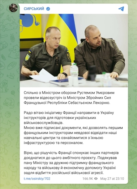 5月27日,烏克蘭武裝部隊(duì)總司令亞歷山大·瑟爾斯基(Oleksandr Syrskyi)在Telegram平臺上發(fā)文,稱法國有意向?yàn)蹩颂m派遣教官,培訓(xùn)烏軍人員,并表示已簽署相關(guān)文件,允許首批法國教官訪問烏軍培訓(xùn)中心。