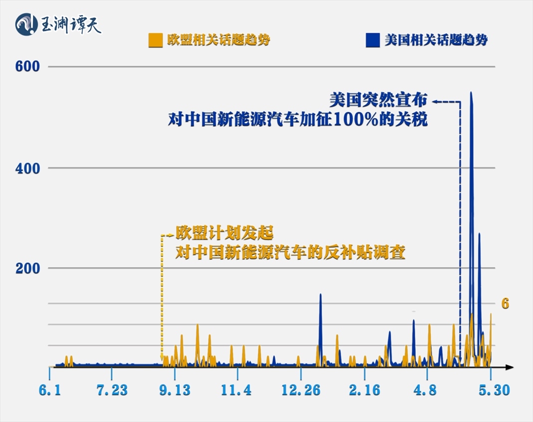 譚主分地區(qū)集納了過(guò)去一年外媒關(guān)于“對(duì)中國(guó)新能源汽車加征關(guān)稅”的報(bào)道,發(fā)現(xiàn)美國(guó)和歐洲地區(qū)出現(xiàn)了明顯的錯(cuò)峰: