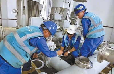工作人員正在對阿聯(lián)酋烏姆蓋萬海水淡化設備管道系統(tǒng)進行維護。盧偉寧攝