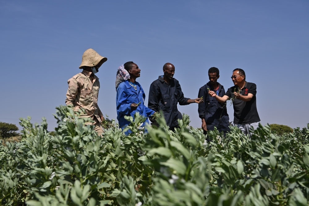 2023年9月27日,在位于厄立特里亞阿斯馬拉的農(nóng)業(yè)技術(shù)援助項(xiàng)目示范地,中國(guó)援厄第三期高級(jí)農(nóng)業(yè)專家組豆類作物專家劉運(yùn)民(右一)與當(dāng)?shù)剞r(nóng)戶交流。為推動(dòng)厄立特里亞農(nóng)業(yè)產(chǎn)業(yè)發(fā)展,中國(guó)農(nóng)業(yè)農(nóng)村部已派出多批專家在厄立特里亞開展涉及豆類作物、果樹園藝、油料等領(lǐng)域的技術(shù)援助工作。