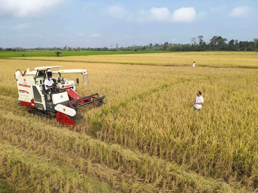 2024年1月8日,在科特迪瓦南部迪沃省格格杜墾區(qū),中國(guó)援科農(nóng)業(yè)技術(shù)合作組組長(zhǎng)郭長(zhǎng)友(右一)指導(dǎo)稻農(nóng)駕駛收割機(jī)收割水稻(無人機(jī)照片)。格格杜墾區(qū)是中科兩國(guó)農(nóng)業(yè)合作示范基地,也是科特迪瓦全國(guó)聞名的水稻種植基地。