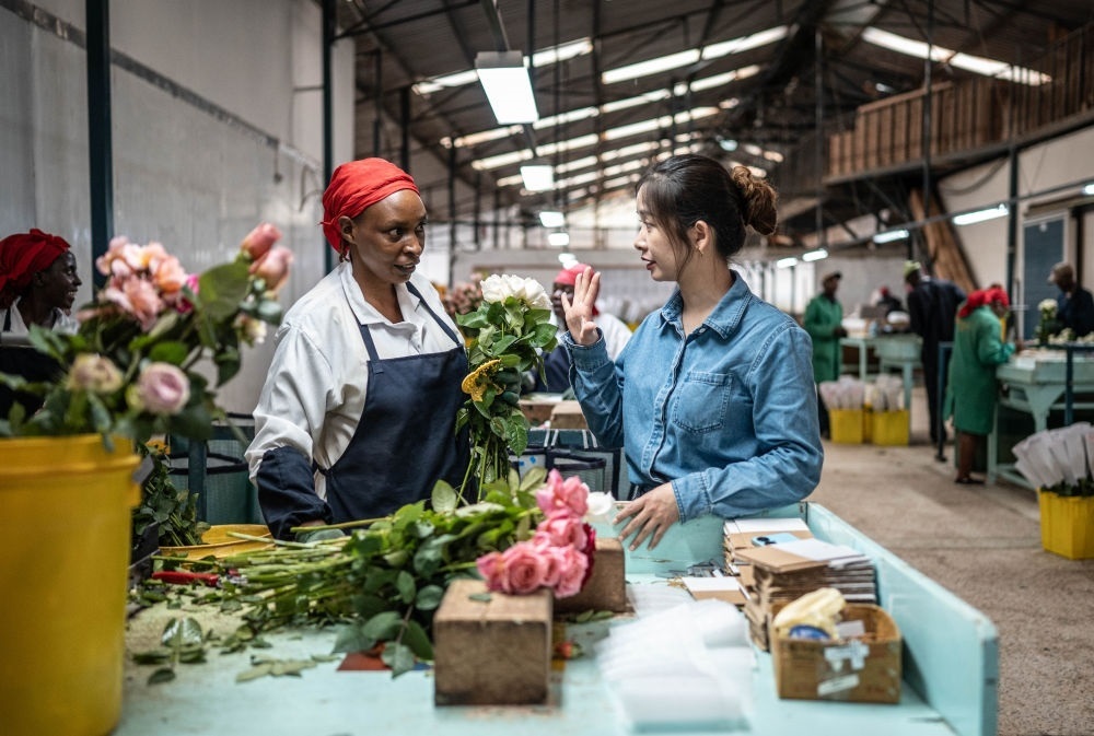 2024年5月18日,湖南璽悅國(guó)際貿(mào)易有限公司負(fù)責(zé)人黃梓楠(右)在肯尼亞納紐基的坦布濟(jì)花卉農(nóng)場(chǎng)挑選鮮花。中國(guó)政府2021年11月宣布為非洲農(nóng)產(chǎn)品輸華建立“綠色通道”,縮短檢驗(yàn)檢疫時(shí)間,擴(kuò)大關(guān)稅豁免,為肯尼亞鮮花及非洲各國(guó)的牛油果、柑橘、菠蘿等特色農(nóng)產(chǎn)品打開了銷路。