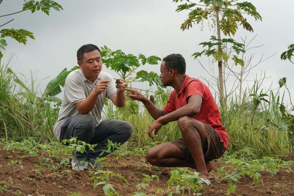 2023年7月15日,在圣多美和普林西比洛巴塔縣卡德拉斯村,中國(guó)援圣普農(nóng)牧業(yè)技術(shù)專家組專家許州達(dá)在田間指導(dǎo)農(nóng)戶努內(nèi)斯種植辣椒。中國(guó)援圣普農(nóng)牧業(yè)技術(shù)專家組與圣普農(nóng)業(yè)、漁業(yè)和農(nóng)村發(fā)展部合作,于2021年在圣普洛巴塔縣卡德拉斯村建立第一個(gè)中圣普農(nóng)業(yè)減貧示范村,并有效結(jié)合中國(guó)農(nóng)業(yè)技術(shù)和扶貧經(jīng)驗(yàn)幫助當(dāng)?shù)剞r(nóng)民增產(chǎn)增收。