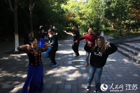 拉加媒體記者與徐州市民共舞。人民網(wǎng) 李昱辰攝