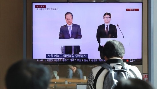 12月8日,在韓國(guó)首爾火車(chē)站,民眾觀看韓國(guó)執(zhí)政黨黨首韓東勛與國(guó)務(wù)總理韓德洙(左)共同會(huì)見(jiàn)記者的電視直播。新華社記者 姚琪琳 攝