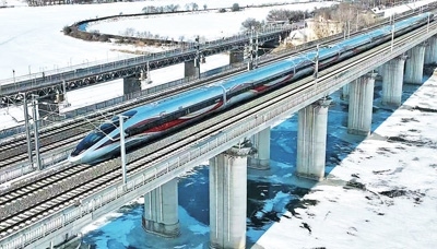 新型復(fù)興號(hào)高寒智能動(dòng)車(chē)組行駛在哈齊高鐵松花江特大橋上。