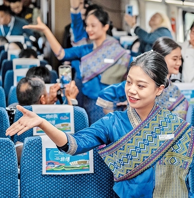 1月14日,中國(guó)鐵路昆明局集團(tuán)有限公司“金花列車(chē)員”在D87次中老鐵路國(guó)際旅客列車(chē)上表演節(jié)目。