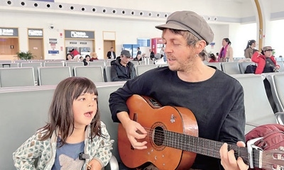西雙版納站,喬納森和孩子在候車(chē)時(shí)一起彈唱。