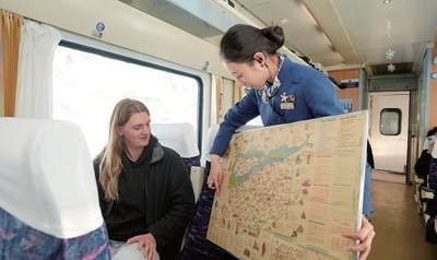 高鐵車(chē)廂內(nèi),乘務(wù)員向米婭(左)介紹哈爾濱旅行攻略。