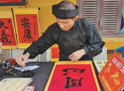 4月13日,在越南河內(nèi)胡志明故居,當?shù)貢覟橹袊慰蜁鴮憽巴摹薄?/p>