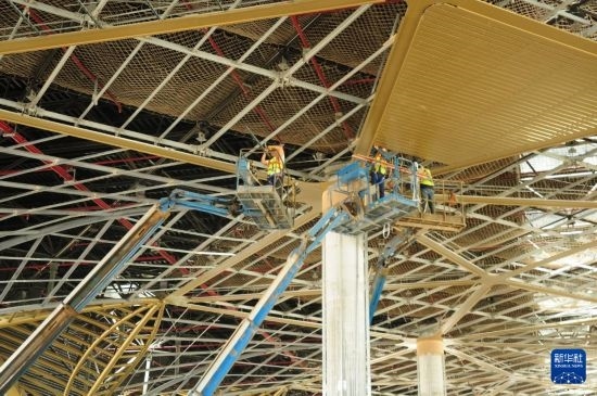 4月8日,建筑工人在伊拉克濟(jì)加爾省納西里耶國際機(jī)場項(xiàng)目主航站樓內(nèi)部施工作業(yè)。新華社記者 段敏夫 攝