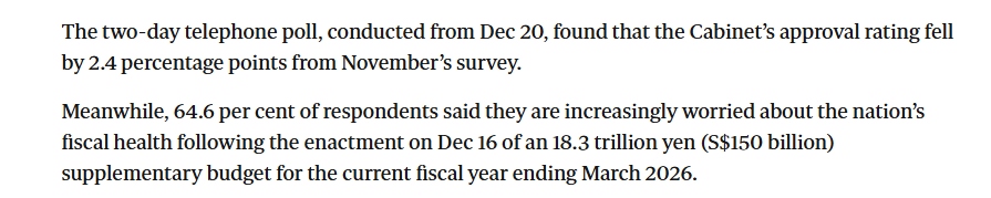 報道指出,目前進口化石燃料占日本發(fā)電量的60%-70%,是推高通脹的主要因素之一,也已影響自民黨支持率。而日本共同社21日公布的最新民調(diào)顯示,高市早苗內(nèi)閣支持率較11月的調(diào)查下降了2.4個百分點,有64.6%的受訪者表示,隨著本月16日2025財年追加預算案的通過,他們對國家財政狀況的擔憂日益加劇。