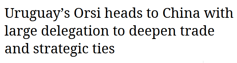 南美新聞機構(gòu)Merco Press報道稱,此次訪問正值烏拉圭與中國建交38周年,烏拉圭總統(tǒng)奧爾西率領(lǐng)約150人的代表團啟程訪華,旨在“加強與烏拉圭最大貿(mào)易伙伴之間的經(jīng)濟聯(lián)系”。