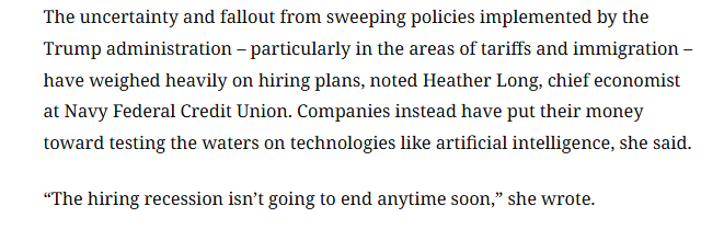 報道還援引美國海軍聯(lián)邦信用合作社(Navy Federal Credit Union)首席經(jīng)濟學家希瑟·朗的觀點稱,特朗普政府推行的一系列政策,尤其是關稅和移民政策,所帶來的不確定性及后果對招聘計劃造成了沉重影響。希瑟·朗認為,招聘市場的低迷狀況短期內(nèi)不會結(jié)束。