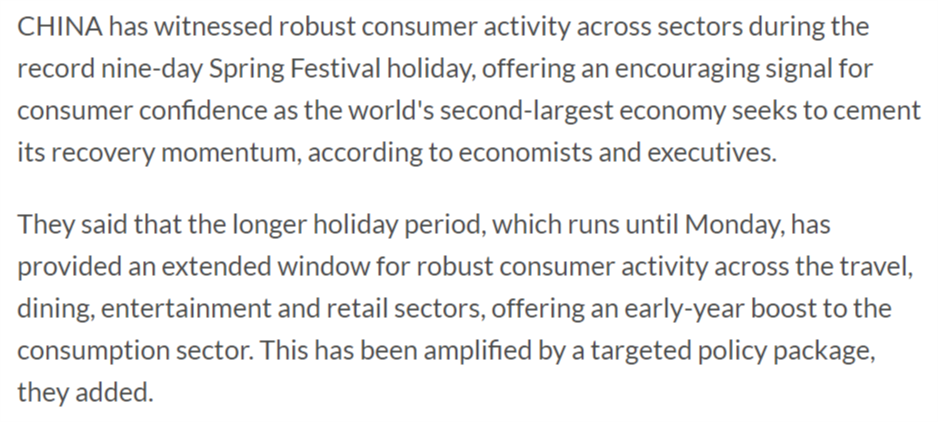 馬來西亞《星報》23日報道稱,在創(chuàng)紀(jì)錄的9天春節(jié)假期期間,中國各領(lǐng)域消費活動強勁,這為世界第二大經(jīng)濟體鞏固復(fù)蘇勢頭傳遞了積極信號,也彰顯了消費者信心。