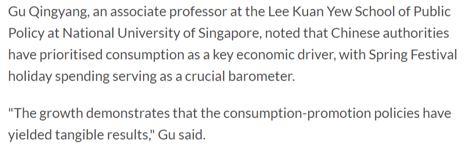 報道援引新加坡國立大學(xué)李光耀公共政策學(xué)院副教授顧清揚的話表示,中國政府已將消費列為關(guān)鍵的經(jīng)濟驅(qū)動力,春節(jié)假期消費則成為重要晴雨表。“增長表明促消費政策已取得切實成效?!?/p>