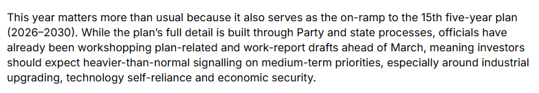文章說,今年的兩會尤為關(guān)鍵,將為第十五個五年規(guī)劃(2026-2030年)奠定基礎。投資者應關(guān)注比往年更明確的政策信號,特別是在產(chǎn)業(yè)升級、科技自主和經(jīng)濟安全等領域。
