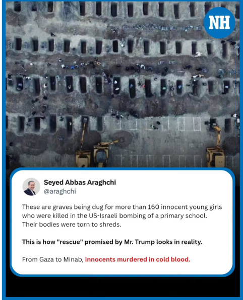 據(jù)報道,阿拉格齊在貼文中表示,“這些墳?zāi)?,是為了埋葬在美以?lián)合轟炸小學(xué)事件中遇難的160多名無辜女孩而挖的。她們的遺體支離破碎。”