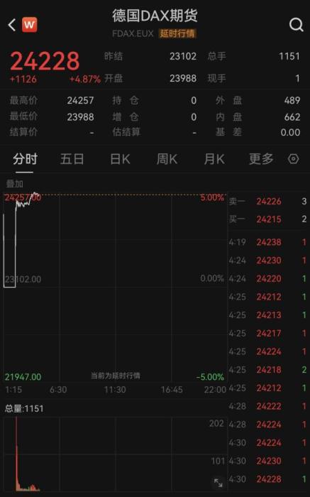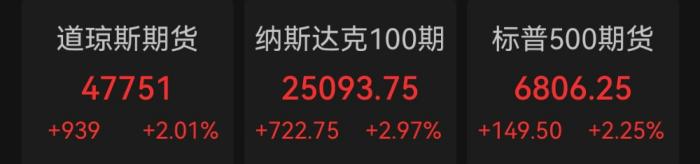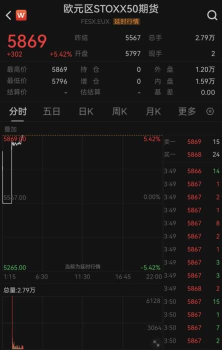 歐美市場期貨同步上漲,歐元區(qū)斯托克50指數(shù)期貨上漲超5.5%,德國DAX期貨最高漲超5%。美股三大指數(shù)期貨均漲超2%,其中納斯達克100期貨小型最多漲超3%。