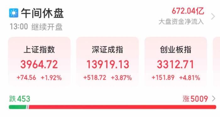 受投資者情緒提振,亞洲股市今早開盤后同步暴漲。午間休盤,A股三大股指仍全部上漲,上證指數(shù)最高漲近2%,深證成指最高漲幅達3.87%,創(chuàng)業(yè)板指數(shù)漲4.81%。午間休盤前,股市中仍有超5000只個股上漲。
