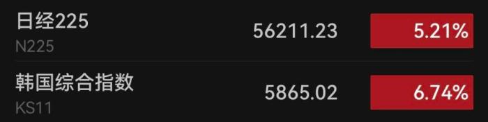 截至8日13:00,日經(jīng)225指數(shù)盤中漲幅超5%,最高報56304.49點。韓國綜合指數(shù)一度漲幅超7%,最高報5882.91點,且仍在持續(xù)走高中。據(jù)韓聯(lián)社報道,韓國綜合股價指數(shù)(KOSPI)和創(chuàng)業(yè)板指數(shù)(KOSDAQ)開盤后雙雙大漲,一度同時觸發(fā)暫停程序化交易的“臨時停牌”(Sidecar)機制。