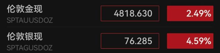 國際貴金屬市場并未因?;鹣⒍禍兀炊@著走高。截至8日13:00,倫敦金現(xiàn)盤中大漲超過3%,再度漲超4850美元/盎司;國際銀價大漲,倫敦銀現(xiàn)盤中漲幅近6%,突破77美元/盎司。