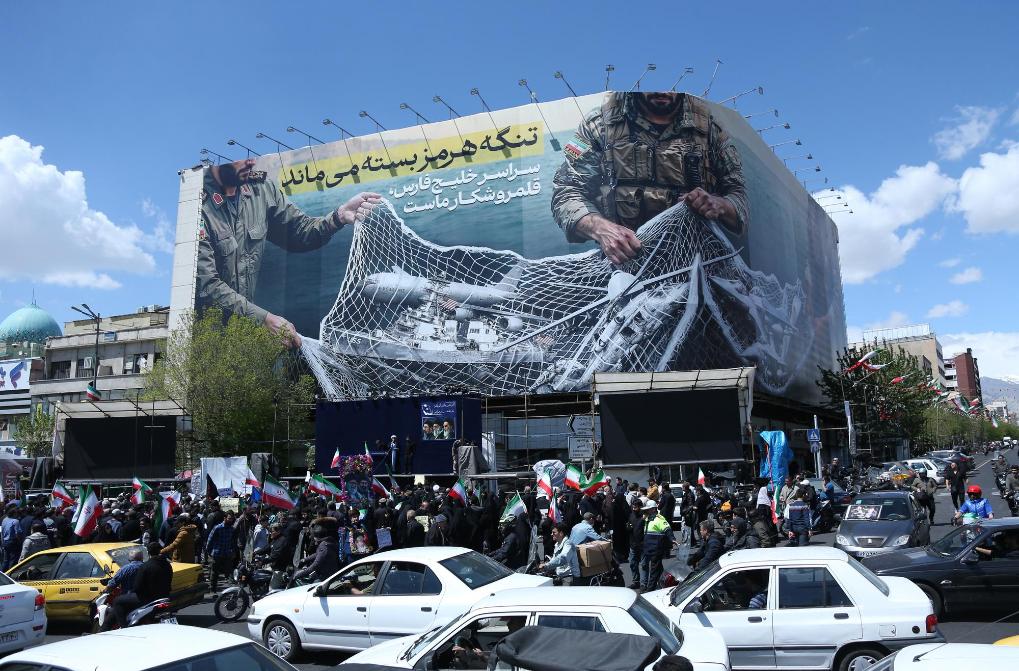 4月8日,民眾在伊朗首都德黑蘭革命廣場(chǎng)參加集會(huì)。廣場(chǎng)的大幅宣傳畫(huà)上描繪著伊朗武裝人員的形象,文字內(nèi)容是“霍爾木茲海峽仍然關(guān)閉 整個(gè)波斯灣都是我們的獵場(chǎng)”。新華社記者沙達(dá)提攝
