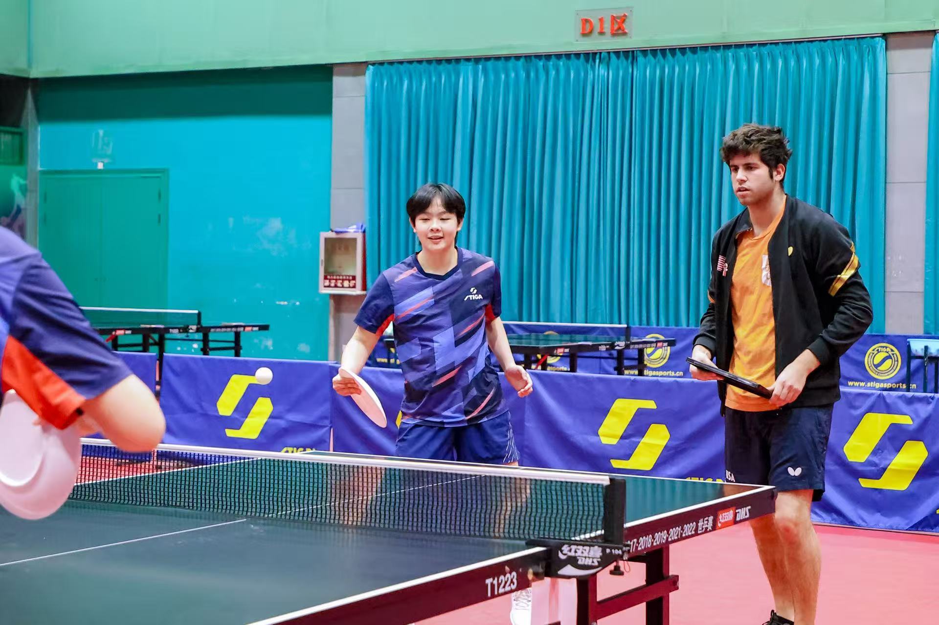 美國乒協(xié)注冊運(yùn)動員凱?扎雷賓在正定國家乒乓球訓(xùn)練基地與中國青少年球員開展友誼賽