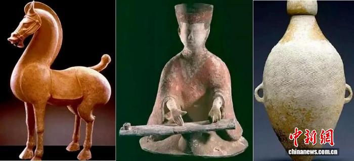 法國(guó)集美博物館藏(左起)東漢時(shí)期陶立馬 、 漢代彈箏陶俑彩色陶、仰韶文化半坡時(shí)期繭形雙耳瓶。圖片來源:人民網(wǎng)