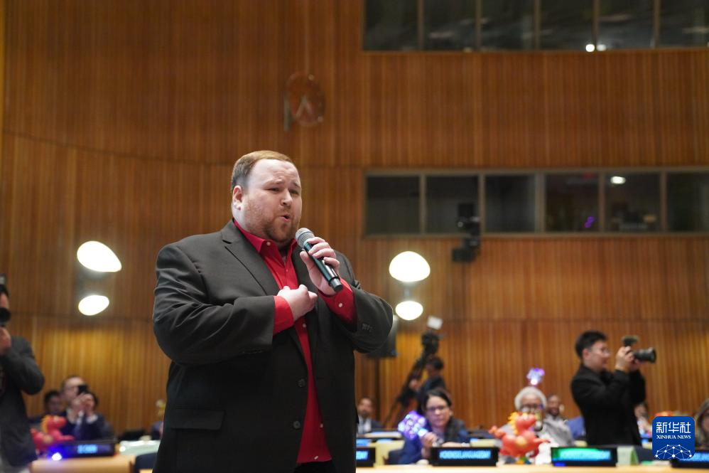 4月13日,在位于紐約的聯(lián)合國總部,美國歌唱家在聯(lián)合國中文日慶?;顒?dòng)上演唱《我愛你中國》。 新華社記者 張鳳國 攝