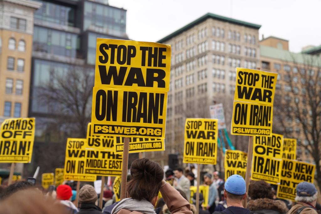 2026年3月7日,人們?cè)诿绹?guó)紐約參加集會(huì)游行,抗議美國(guó)和以色列對(duì)伊朗發(fā)動(dòng)軍事打擊。新華社記者張鳳國(guó)攝