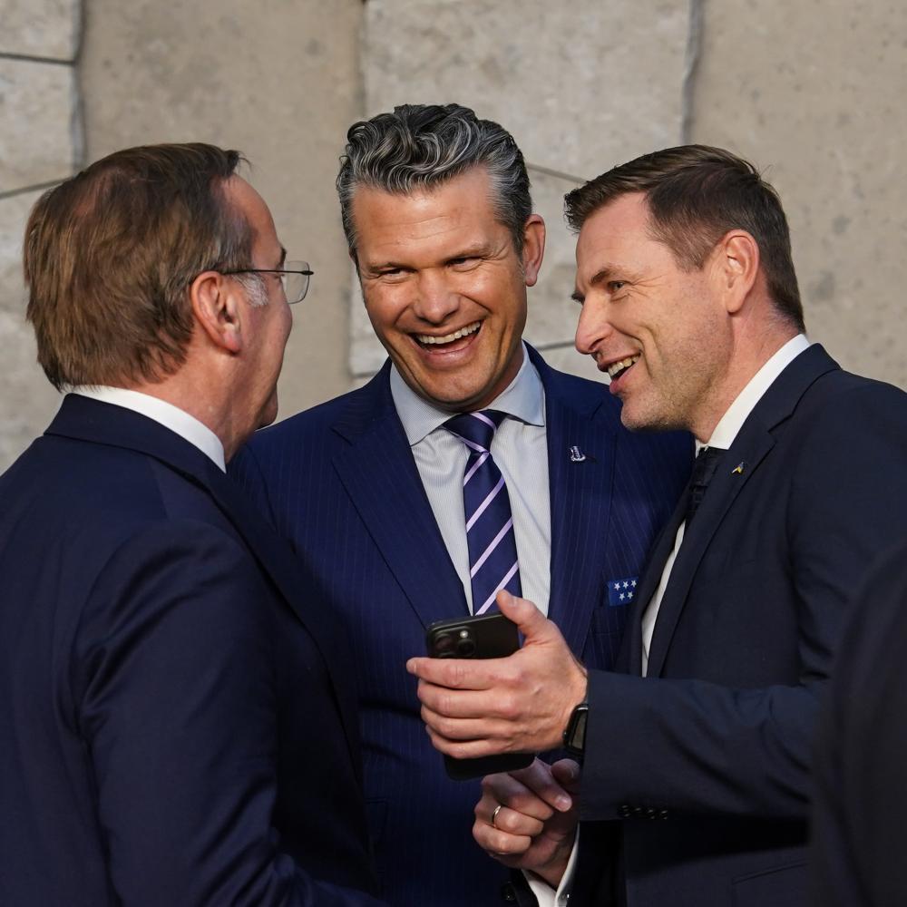 2025年10月15日,在比利時(shí)布魯塞爾舉行的北約防長(zhǎng)會(huì)議結(jié)束后,美國(guó)國(guó)防部長(zhǎng)赫格塞思(中)與愛沙尼亞國(guó)防部長(zhǎng)佩夫庫(kù)爾(右)、德國(guó)國(guó)防部長(zhǎng)皮斯托里烏斯交談。新華社記者彭子洋攝