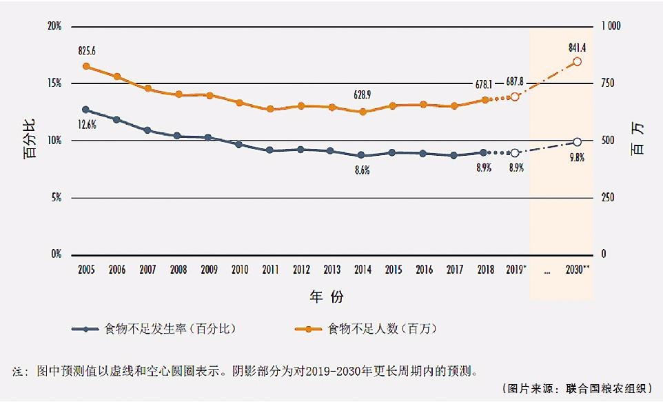 全球食物不足發(fā)生率及人數逐年統(tǒng)計和預測圖(圖片來源:聯(lián)合國糧農組織)