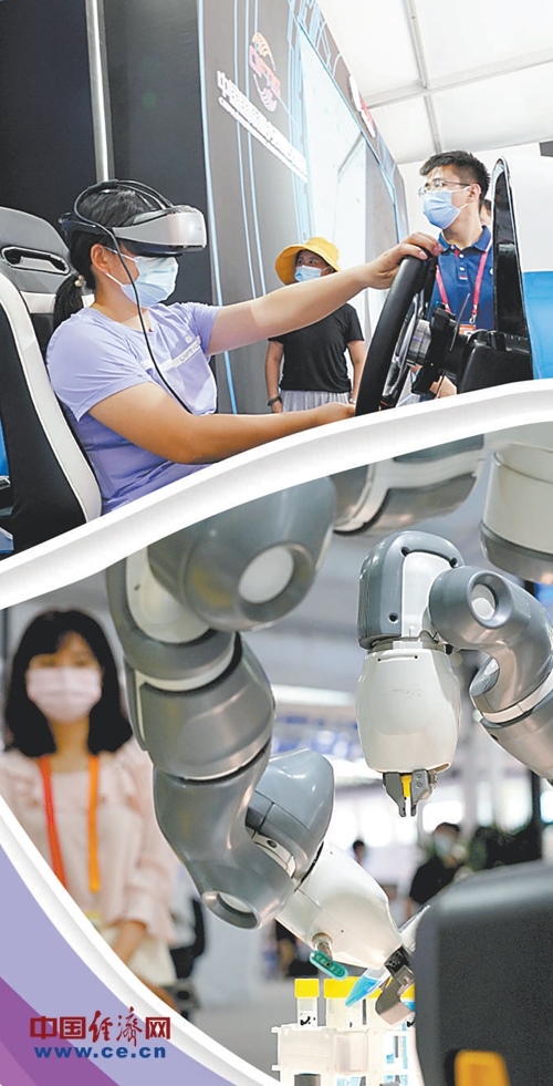 上圖:觀眾在2020服貿(mào)會(huì)5G通信服務(wù)展區(qū)體驗(yàn)5G高速網(wǎng)絡(luò)帶來的仿真駕駛。下圖:觀眾在2020服貿(mào)會(huì)服務(wù)機(jī)器人展區(qū)參觀醫(yī)用機(jī)器人。經(jīng)濟(jì)日?qǐng)?bào)-中國(guó)經(jīng)濟(jì)網(wǎng)記者趙晶攝