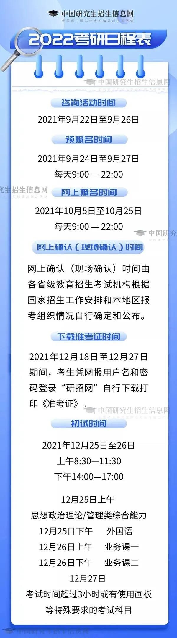 根據(jù)《2022年全國碩士研究生招生工作管理規(guī)定》,2022年研考網(wǎng)上報(bào)名時(shí)間為2021年10月5日至10月25日。網(wǎng)上預(yù)報(bào)名時(shí)間為2021年9月24日至9月27日。