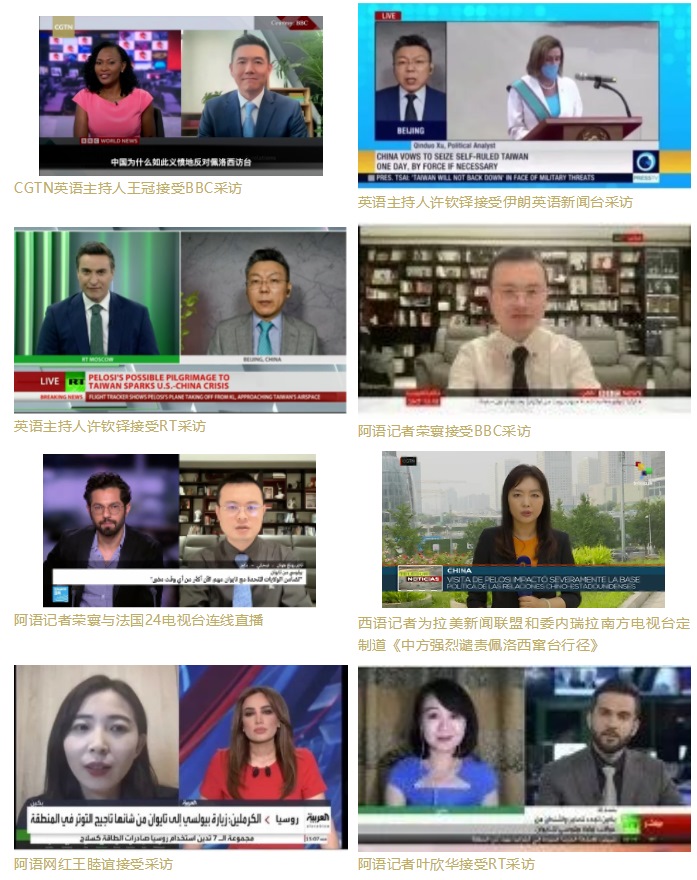 CGTN英、西、法、阿、俄等多語種主播、評論員和網(wǎng)紅積極在多家外媒發(fā)聲,接受了包括英國廣播公司(BBC)、今日俄羅斯(RT)、伊朗英語新聞臺(Press TV)、拉美新聞聯(lián)盟、貝寧E-TELE電視臺、法國24電視臺、沙特阿拉比亞電視臺以及以色列i24news電視臺等多家國際媒體的采訪連線,主動(dòng)闡釋中方立場,分析佩洛西這一挑釁行徑背后的虛偽動(dòng)因,揭批美國在臺灣問題上“說一套做一套”、侵犯中國的主權(quán)和領(lǐng)土完整的行為。