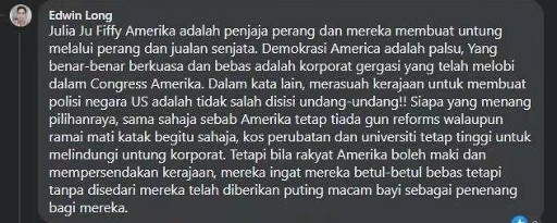 馬來西亞網(wǎng)友Edwin Long留言:“美國就是戰(zhàn)爭販子,他們通過戰(zhàn)爭和販賣武器獲利。美國的民主只是假象,真正享有權(quán)力和自由的是在幕后主導(dǎo)國會(huì)的大企業(yè)。換句話說,官商勾結(jié)在美國的法律上是被允許的!無論誰贏得選舉,一樣不會(huì)禁槍,醫(yī)療和教育成本還是不會(huì)下降,因?yàn)橐S護(hù)大企業(yè)的利益。但是他們的人民覺得他們能罵政府就是自由的,全然沒有意識到這不過是安撫奶嘴罷了?!?/p>