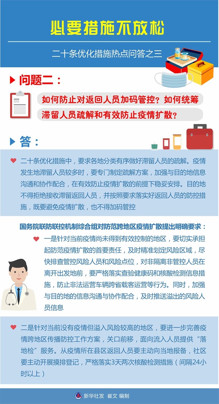 答:二十條優(yōu)化措施中,要求各地分類有序做好滯留人員的疏解。疫情發(fā)生地滯留人員較多時(shí),要專門制定疏解方案,加強(qiáng)與目的地信息溝通和協(xié)作配合,在有效防止疫情擴(kuò)散的前提下穩(wěn)妥安排。目的地不得拒絕接收滯留返回人員,并按照要求落實(shí)好返回人員的防控措施,既要避免疫情擴(kuò)散,也不得加碼管控。