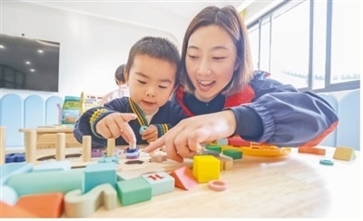 浙江省湖州市德清縣阜溪街道興山未來社區(qū)嬰幼兒照護驛站,幼兒在志愿者指導下拼搭積木。王樹成攝(影像中國)