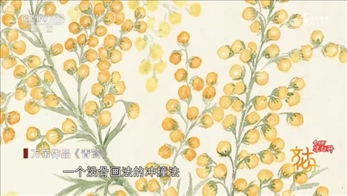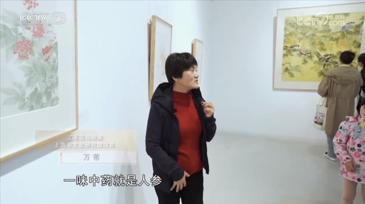 工筆花鳥畫家 上海市文史研究館館員 萬芾:我們看看這幅,這幅應該我們很熟悉的一味中藥材就是人參,看了中藥這么美麗的花,這么有生命力的現(xiàn)象,是不是我們吃的時候也不苦了。