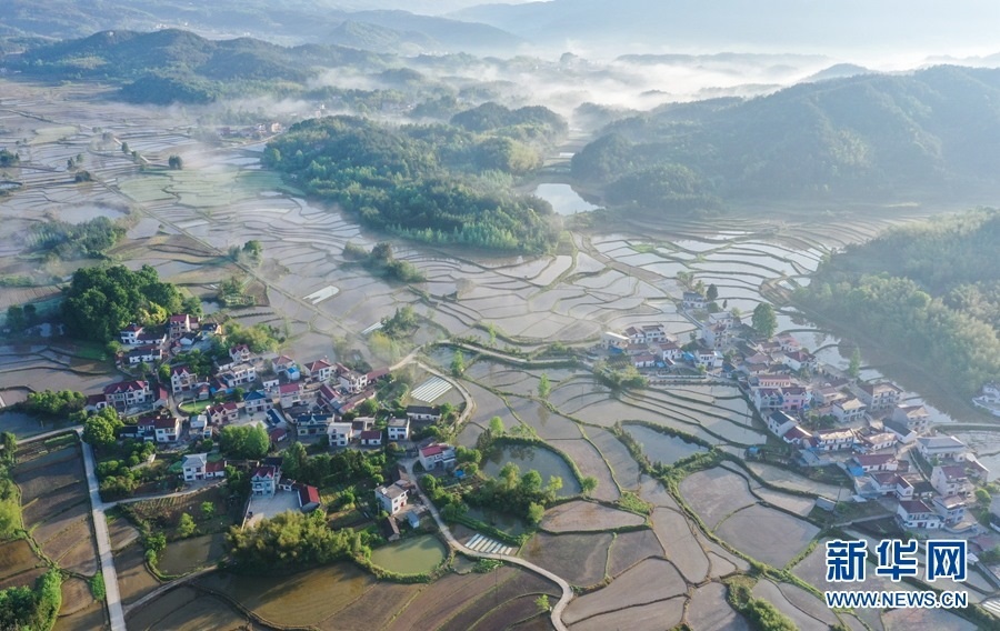 春日清晨,航拍安徽省宣城市旌德縣興隆鎮(zhèn)三山村,線條優(yōu)美的梯田、若隱若現(xiàn)的村莊、濃淡相宜的云霧、變幻莫測的朝霞,描繪出一幅幅美麗的鄉(xiāng)村畫卷。
