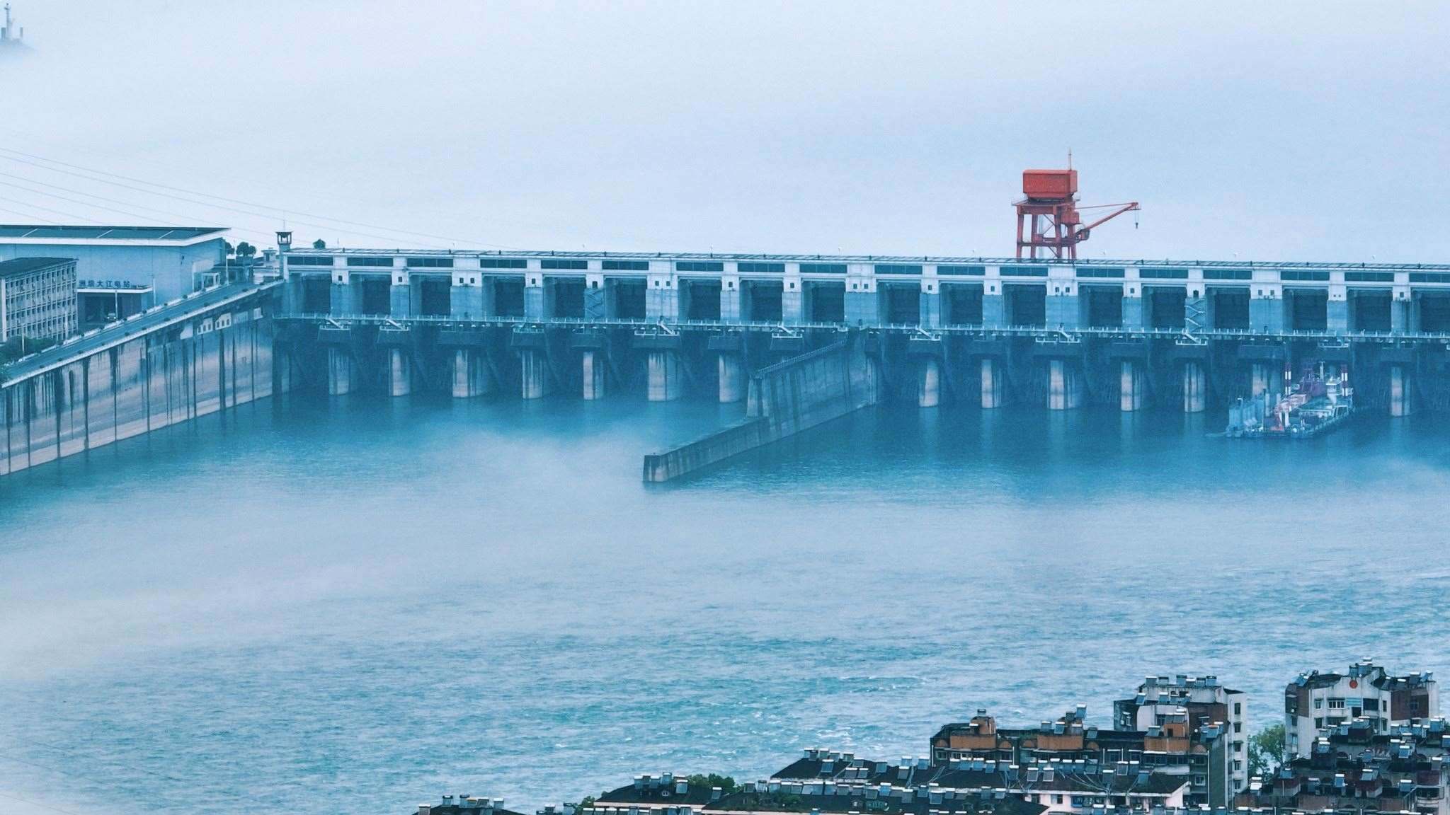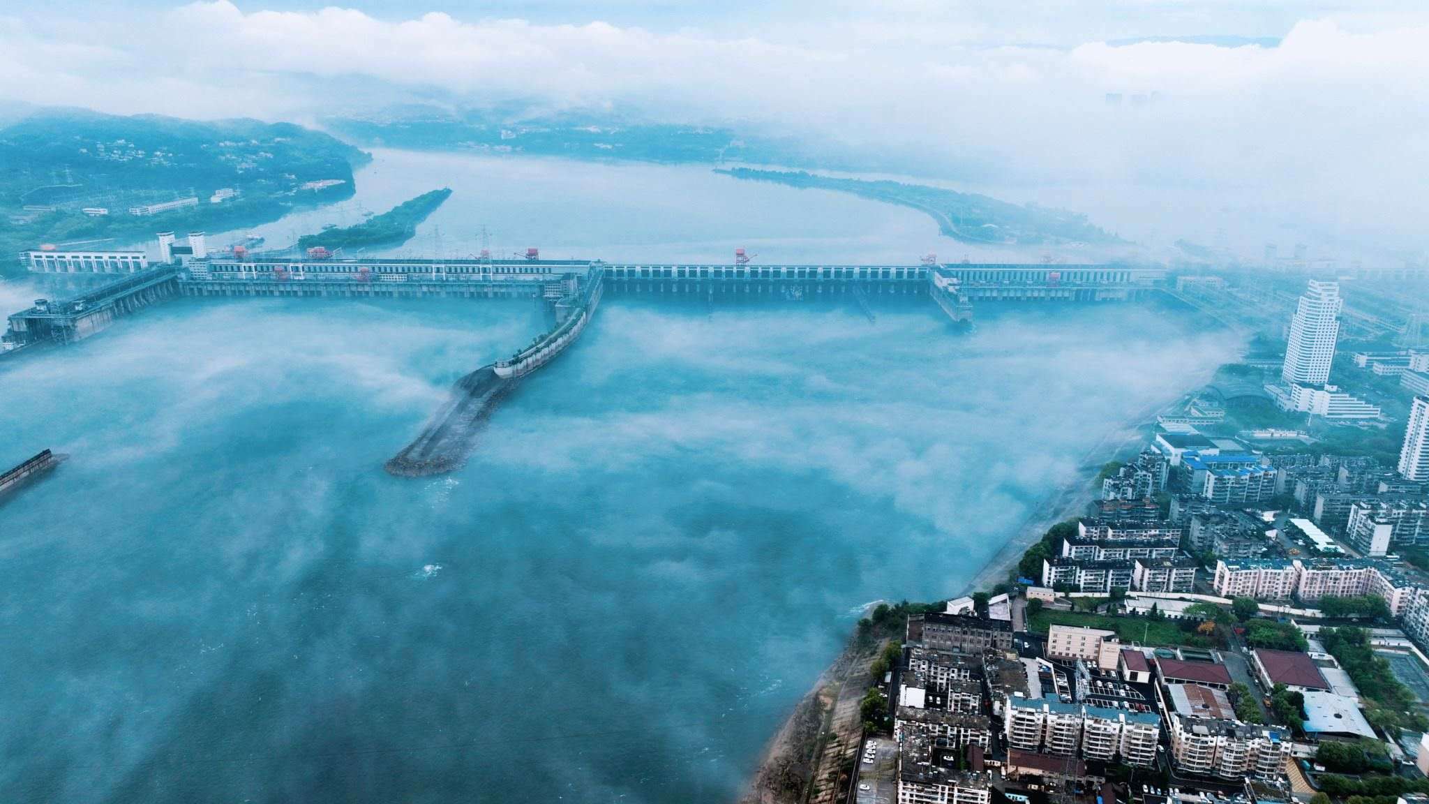 2023年5月4日,湖北宜昌,一場大雨過后,長江上薄霧籠罩,城市建筑在霧中若隱若現(xiàn)。視覺中國
