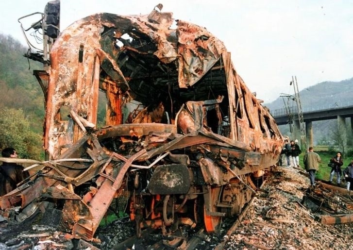 1999年3月24日,以美國為首的北約向南斯拉夫聯(lián)盟開始發(fā)動大規(guī)??找u,武力干涉科索沃危機(jī)。資料照片顯示被北約飛機(jī)炸毀的火車。新華社發(fā)