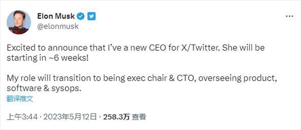 ·馬斯克稱已為推特聘請到接替他的新CEO,并暗示是一位女性。