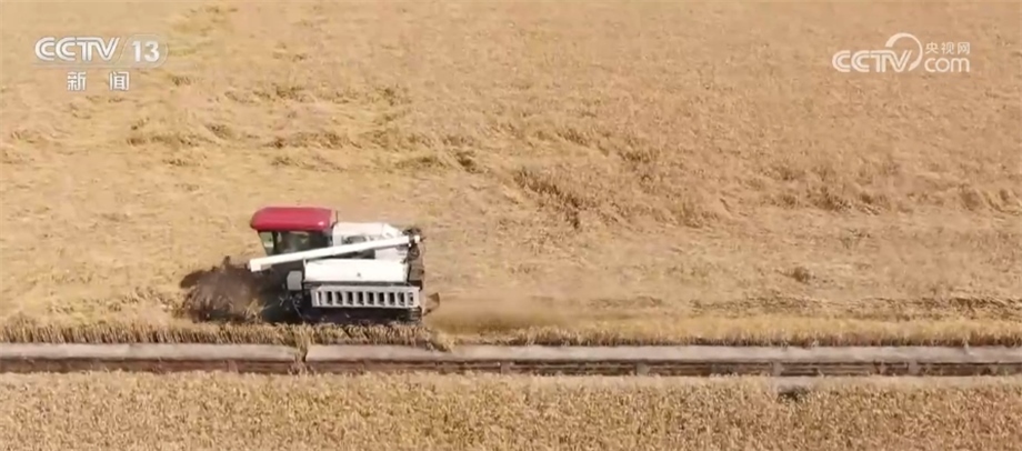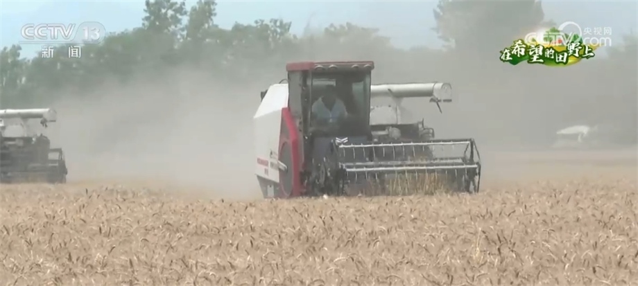 總臺記者 趙雄:歡迎大家跟隨我們的鏡頭一起走進成都平原,來感受豐收的喜悅。我現(xiàn)在所在的位置是四川邛崍市的萬畝糧油示范基地。在我身后,200多畝成片的小麥已經(jīng)成熟,放眼望去,金黃的麥穗在風(fēng)中搖曳,麥浪翻滾煞是喜人。在麥田上,我們可以看到多臺大型收割機來回穿梭作業(yè),一簇簇麥穗被卷入收割機倉,收割、脫粒、除雜一氣呵成,金色麥粒傾瀉入倉。