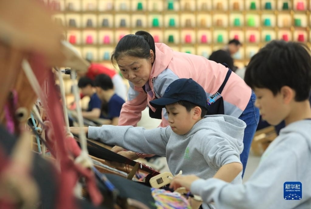 5月12日,來自上海包玉剛實驗學(xué)校的學(xué)生在張家界市武陵源區(qū)乖幺妹土家族織錦基地學(xué)習(xí)體驗土家族織錦非遺技藝。