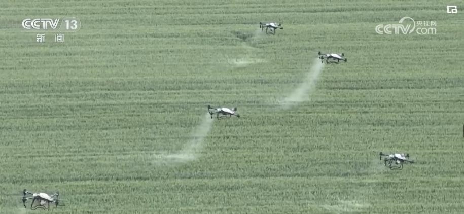 在運城河津市的小麥地里,10架無人機正在麥田上方進(jìn)行噴灑作業(yè)。