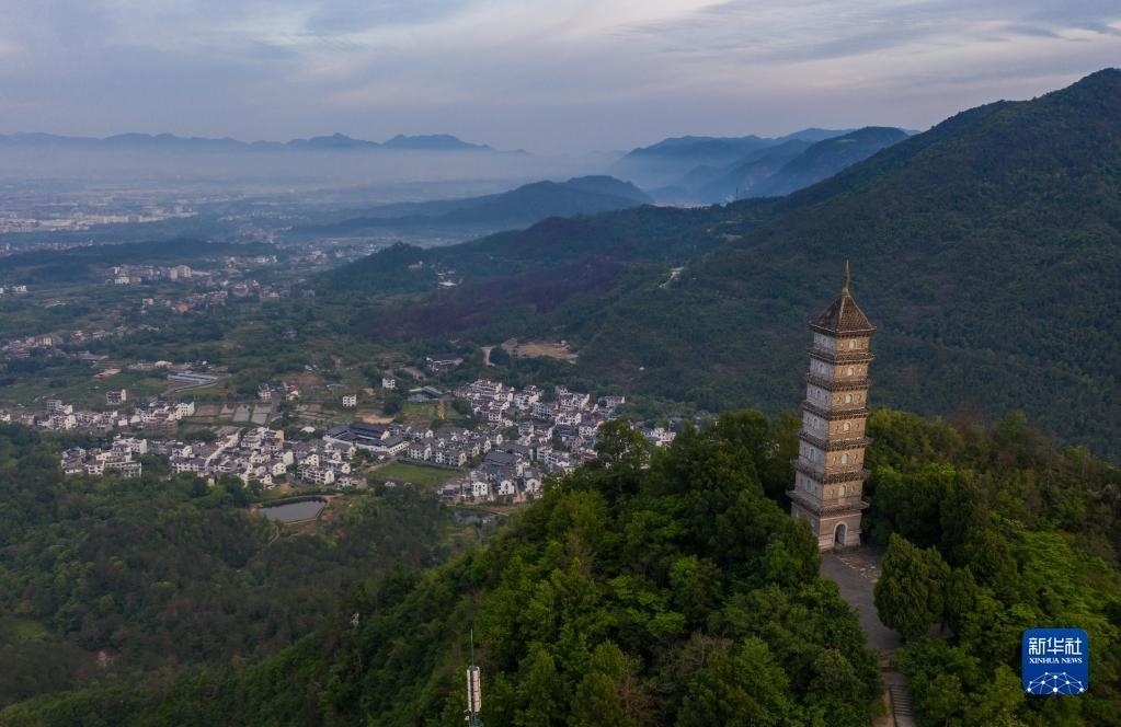 俯瞰天臺縣的赤城山及山頂?shù)牧哄?月16日攝,無人機照片)。