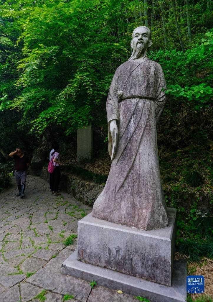 石梁飛瀑景區(qū)的徐霞客雕像(5月16日攝)。